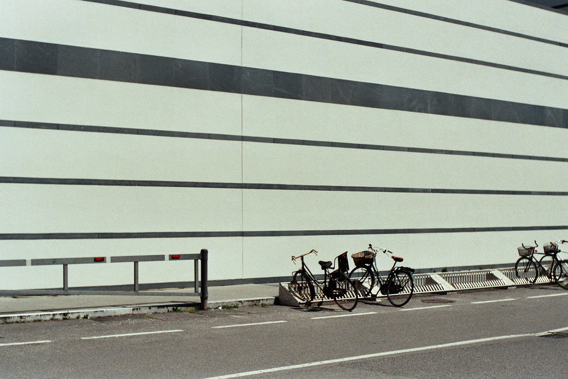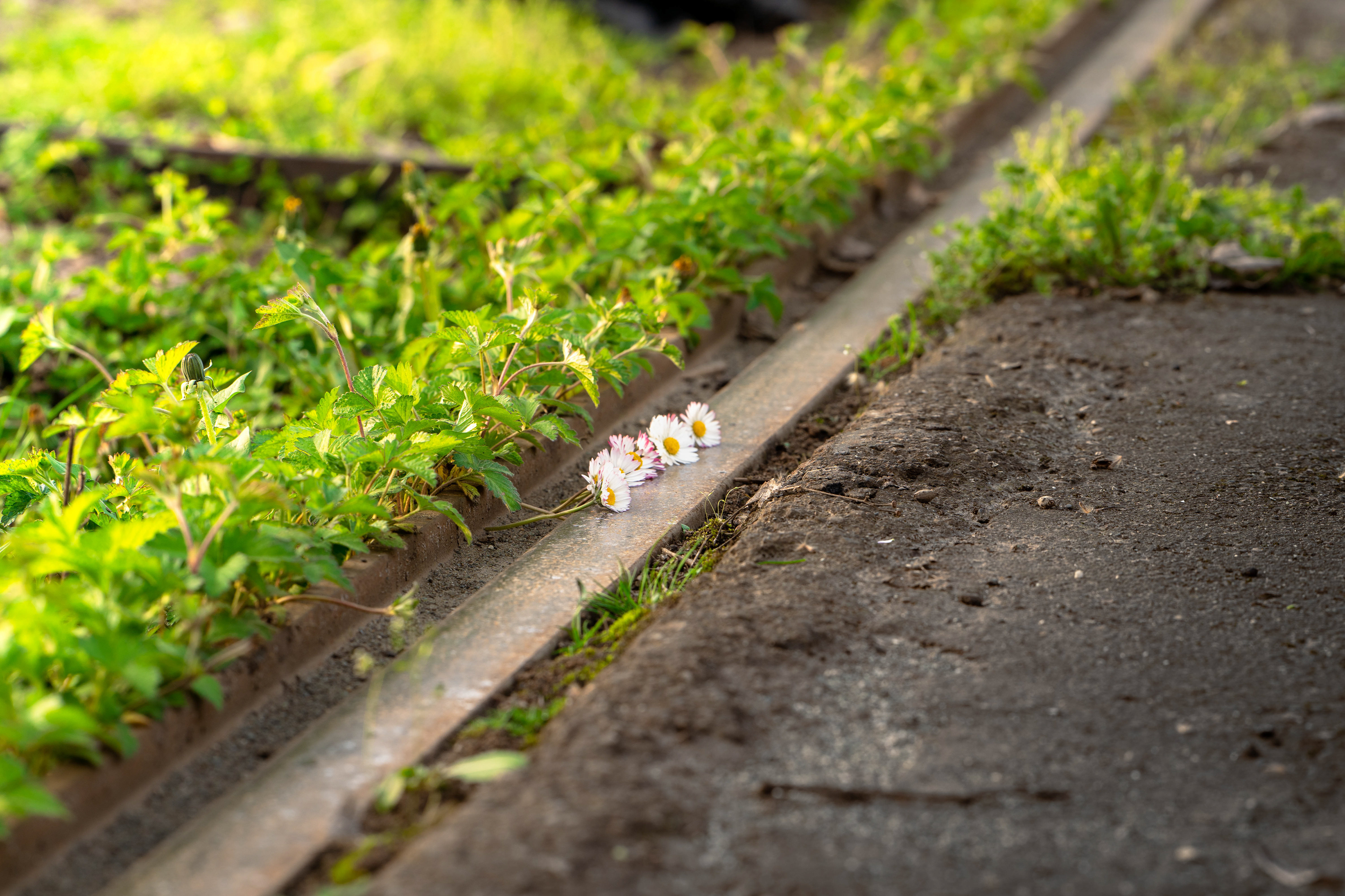 The composition is split in half by the rail, covered with earth. One evening, walking down these rails I found some daisies, leaning on to it, just as if they were dropped there by the wind. They became the perfect symbol of natural resilience inside a chaotic daily life.